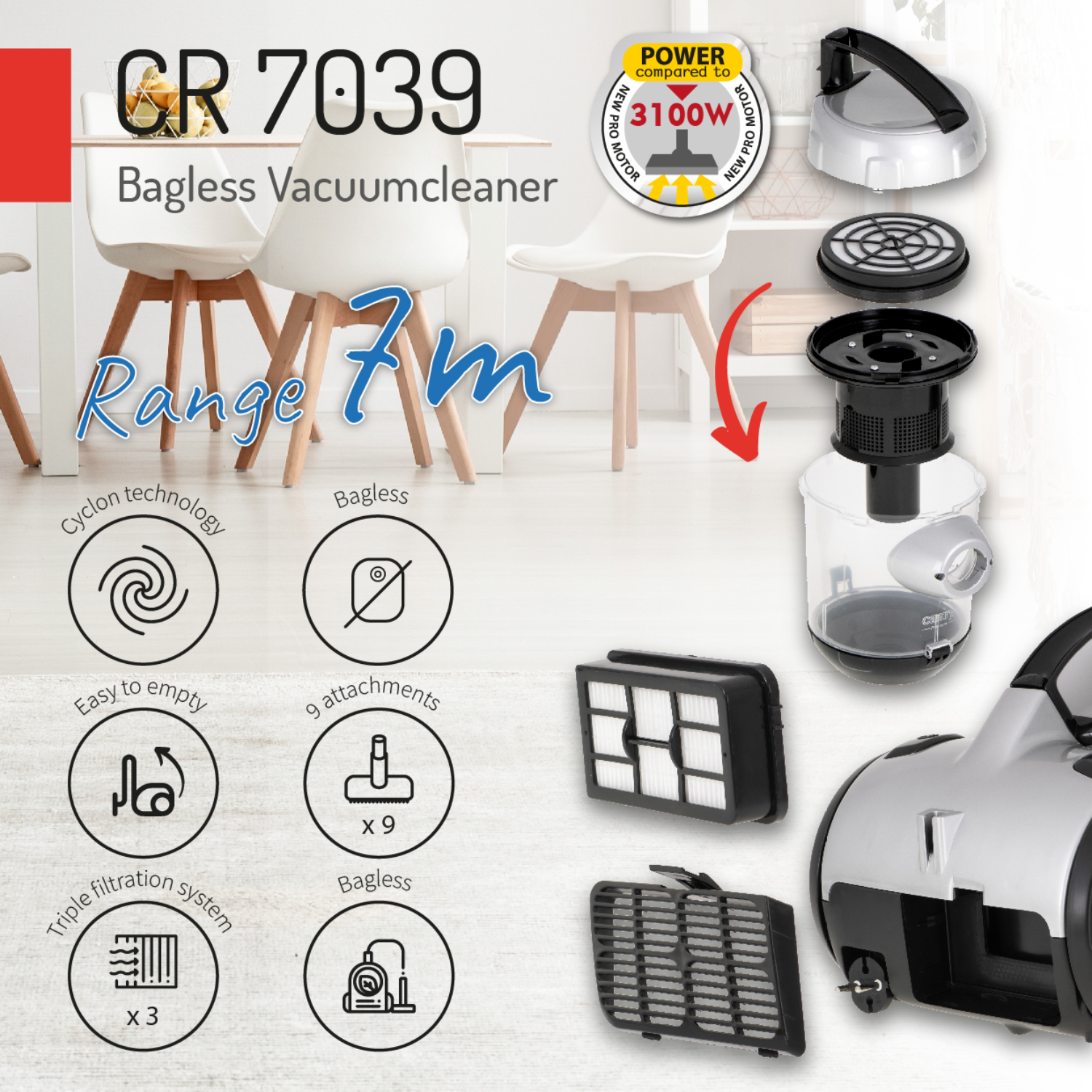 The bagless vacuum cleaner CR 7039 is a high-quality vacuum cleaner equipped with a modern motor with a maximum power of 3100 W. In the set, as many as 9 pads for cleaning hard-to-reach surfaces. You do not have space to store many brushes for different surfaces? You dont like “dirty work”, ie changing bags in an old vacuum cleaner? You couldnt have hit better!