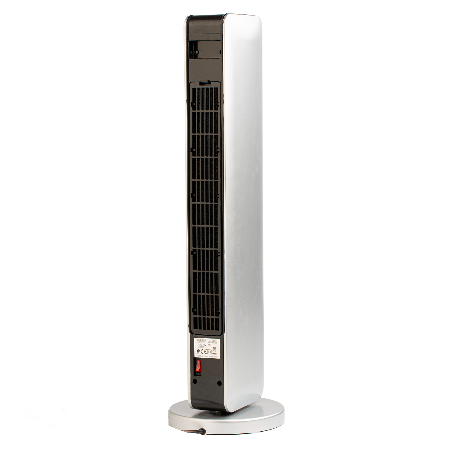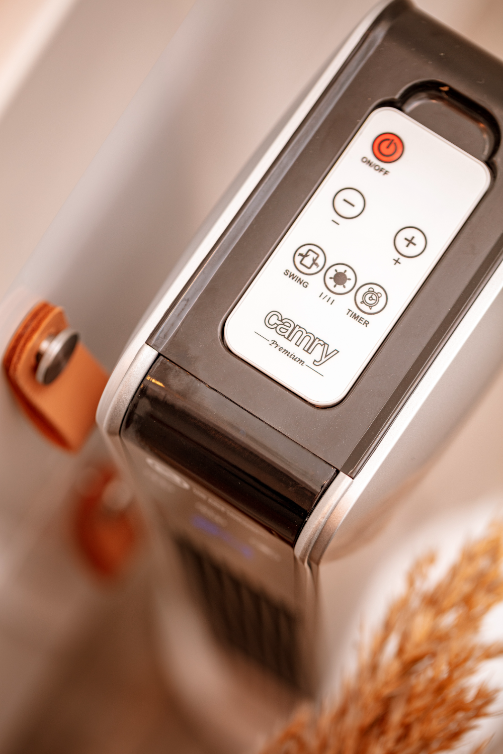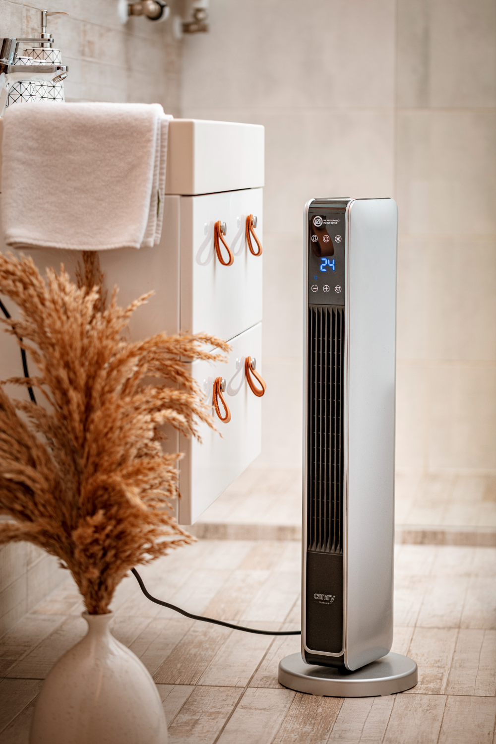 Fan heater with efficient ceramic heater, LCD display and remote control. The device has a timer that allows you to set the working time from 1 to 8 hours. LCD display indicates the selected temperature in the range of 10-49° C, activation of selected functions. The fan heater heats with power 1200W or 2200W, has a horizontal oscillation function in the 70° range, a safety switch that automatically cuts off power in the event of the device overturning, protection against overheating and a handle for convenience of carrying. The device is equipped with a remote control and storage space.
