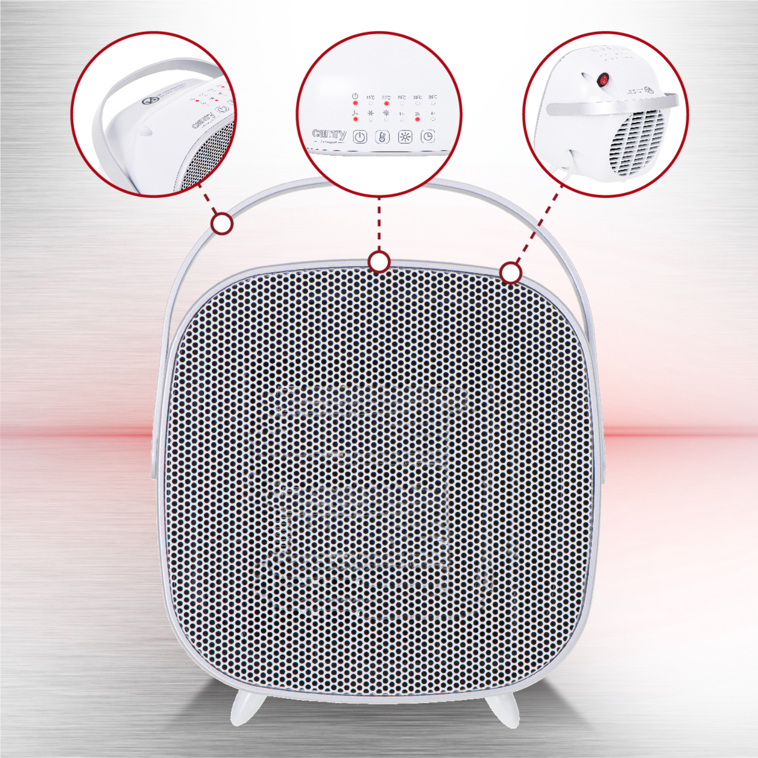Ceramic heater with an efficient ceramic heater. The device has a timer that allows you to set the working time from 1 to 7 hours. The LED display shows the selected temperature in the range of 15-35 ° C and the 2nd level of heating power. The fan heater heats with the power of 1100W or 1500W. Safety switch automatically cuts off the power in the event of the device overturning, protection against overheating The device has the functions of cooling the heater and the fan.