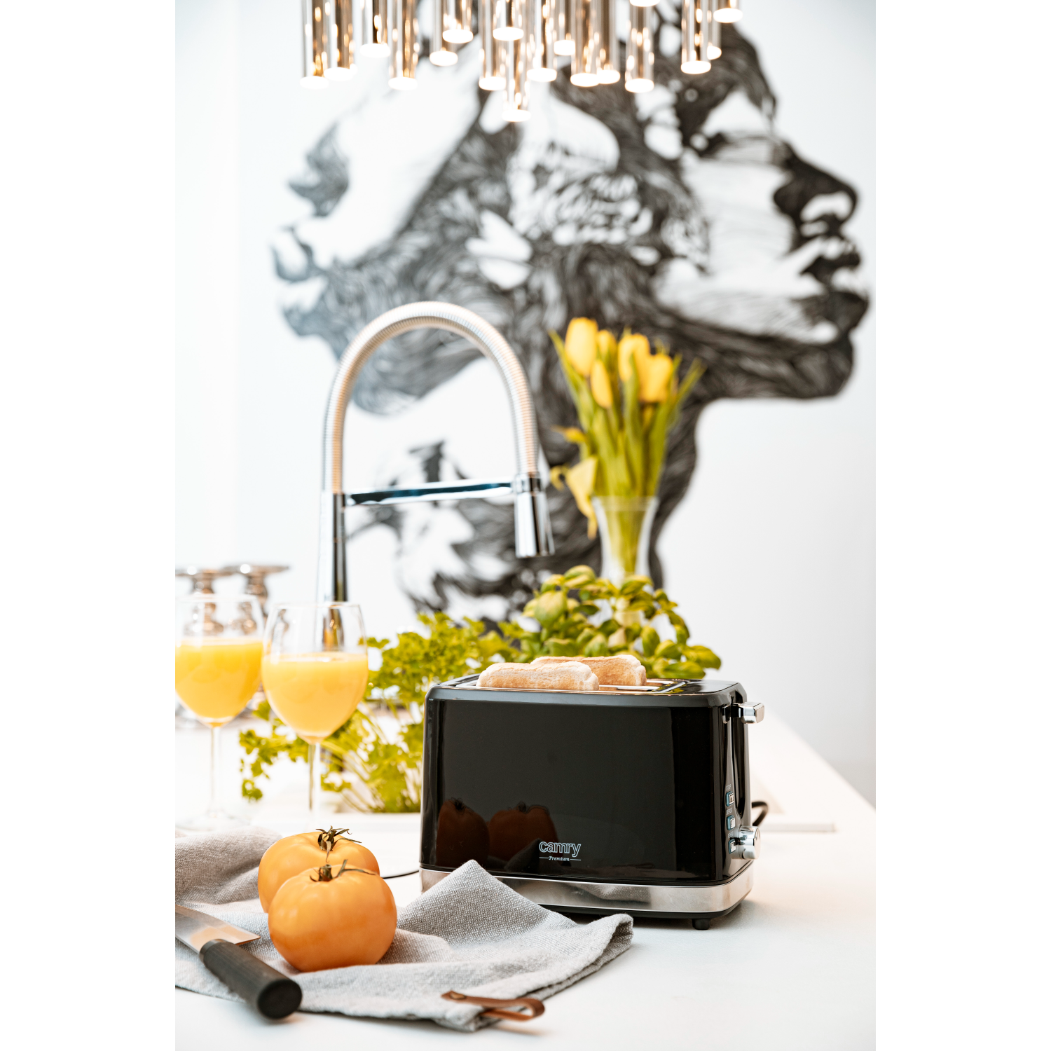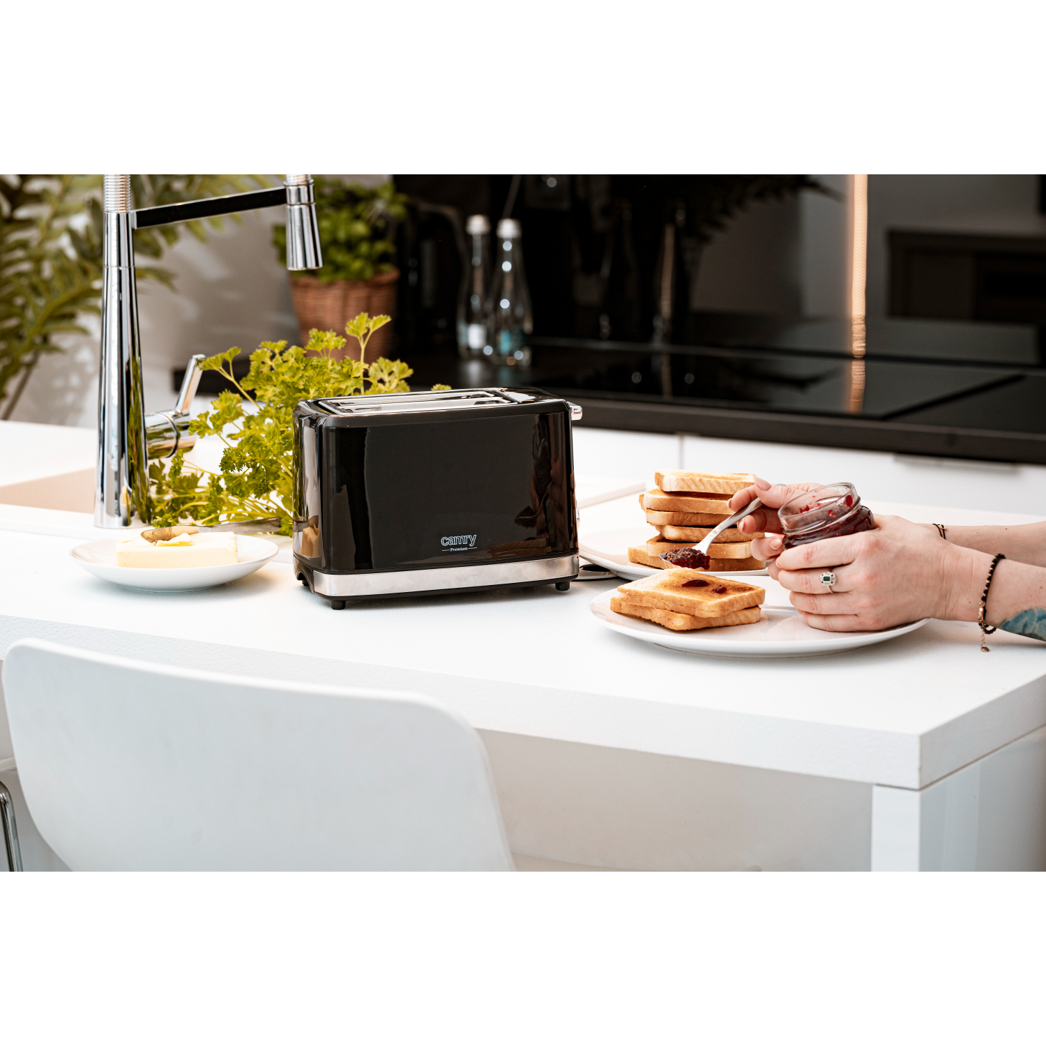 An efficient 900 W toaster in which two toasts at a time can be prepared. The browning adjustment knob allows to prepare toasts the way one likes the best. Thanks to that they are exactly as crispy as they should be. The crumb tray helps in keeping the device, as well as the place where one prepares a meal, clean. When the toaster is on its housing remains cool – this is one of the factors that increase the safety of operating the device. One can stop the browning process using the STOP button. The toaster has also a bonus function increasing its utility – a grill to heat up bread rolls.