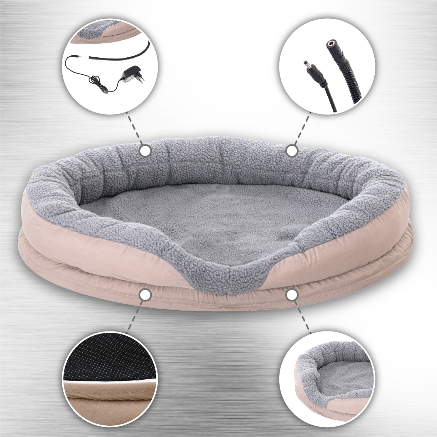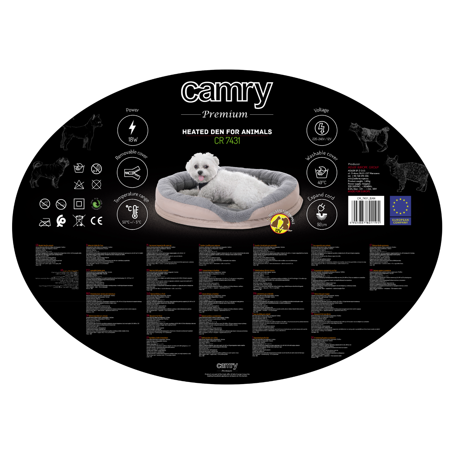 Therefore, if your pet is often cold, elderly or has problems with joints, a heated den for animals CAMRY CR 7431 may be a good solution. The den we recommend has the shape of an ellipse and has a platform on which a dog or cat can rest its head. The removable zippered cover is washable at 40 degrees Celsius and makes it easy to keep the bed clean. The outer fabric is resistant to mechanical damage, and the inside is pleasant to the touch. The device has a power supply that converts the voltage, and heating elements are additionally put in a cover so that they could be easily removed if necessary.