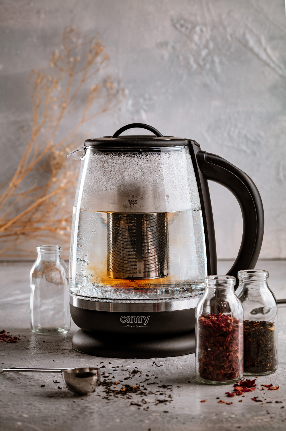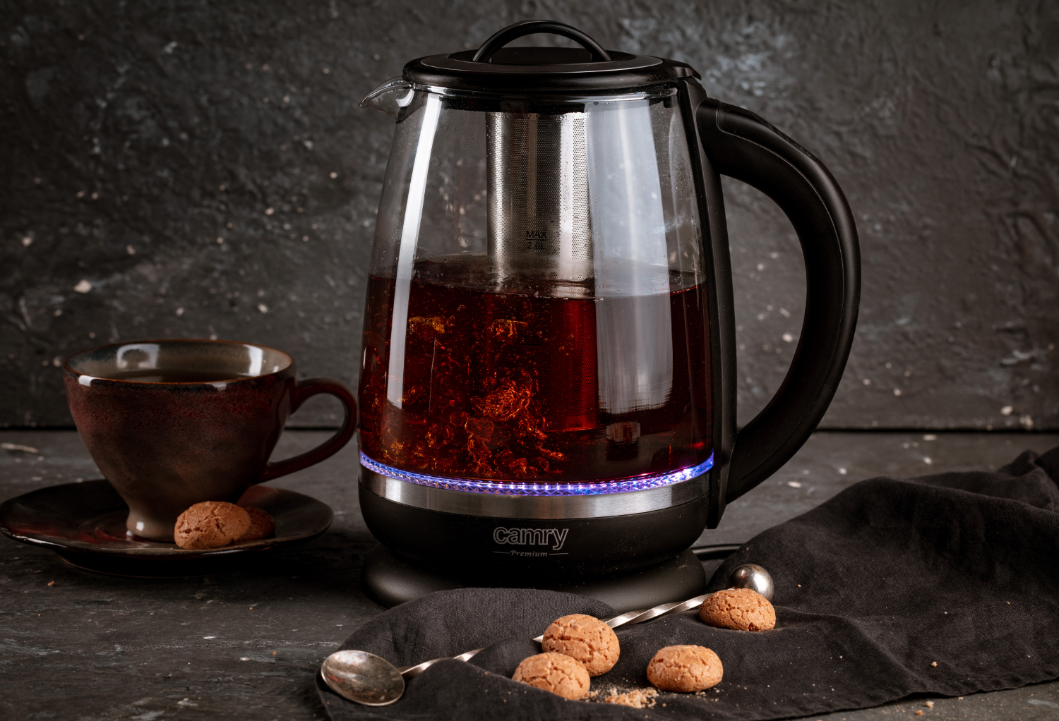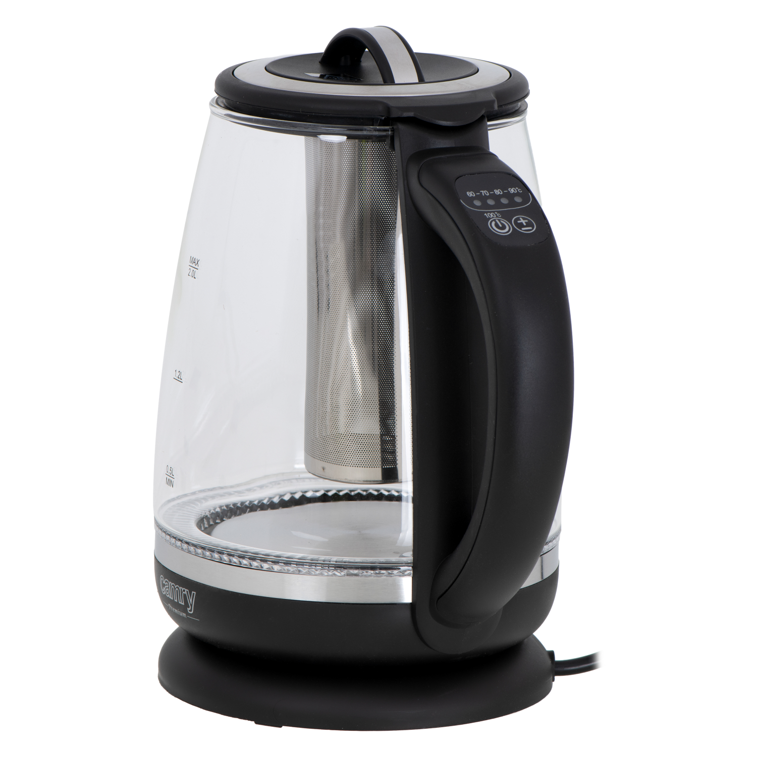 The 2-liter kettle with temperature control is equipped with a removable basket for brewing tea and herbal infusions. Adjusting the temperature in the range of 60 to 100 degrees C will prepare the perfect herbal infusion. This function is also useful in other situations where boiled water would have to cool slightly before using it. The temperature is regulated by buttons on the kettle and the LED backlight in 5 colors informs about the selected heating temperature. The CR 1290 kettle is equipped with a thermal fuse that prevents the device from overheating. In addition, the user is informed by a sound signal when the water boils.