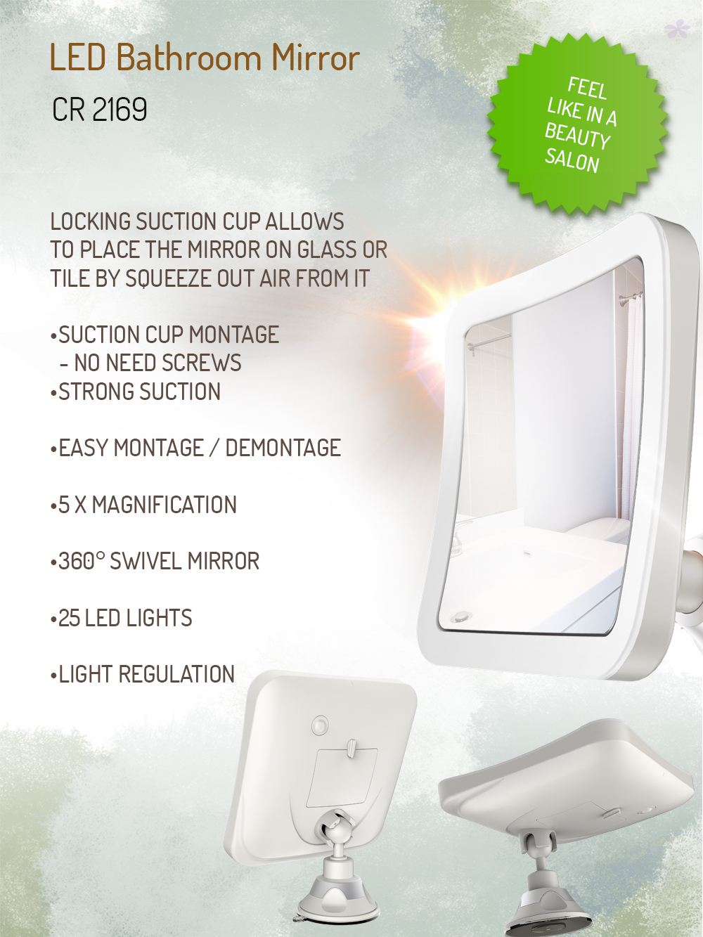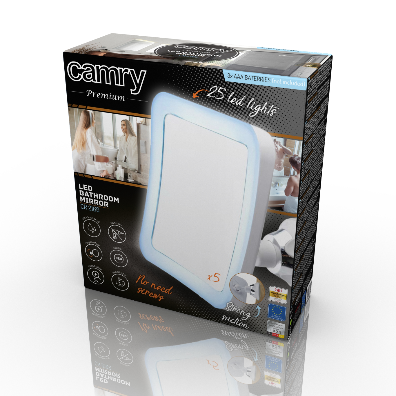 There is not enough light in your bathroom, which makes daily care difficult? Do you have the impression that the current mirror is insufficient and does not fulfil its function? Or maybe you are looking for an interesting and original way to improve the functionality of the space above the washbasin? LED bathroom mirror CAMRY CR 2169 will solve all these problems! In a few moments, you will feel like in a real beauty salon! The practical CR2169 LED mirror is the perfect aid for precise shaving and perfect make-up, thanks to LED backlighting and 5x magnification. The mirror is mounted without a single screw, without the use of a drill, easy to mount and dismount to take, for example, on a journey. The product is powered by batteries (3 pcs. AA).