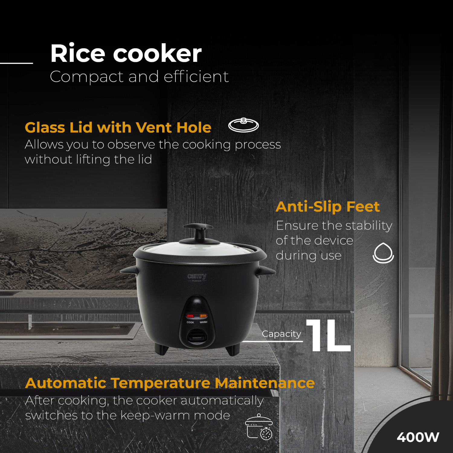 - Capacity and Power:Â The ideal capacity of 1 liters caters to the needs of smaller households, while the 400W power ensures quick cooking without excessive energy consumption.