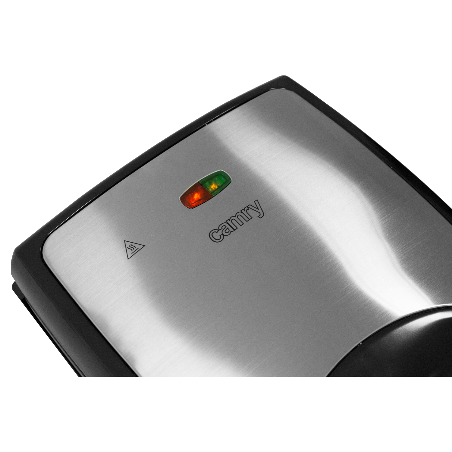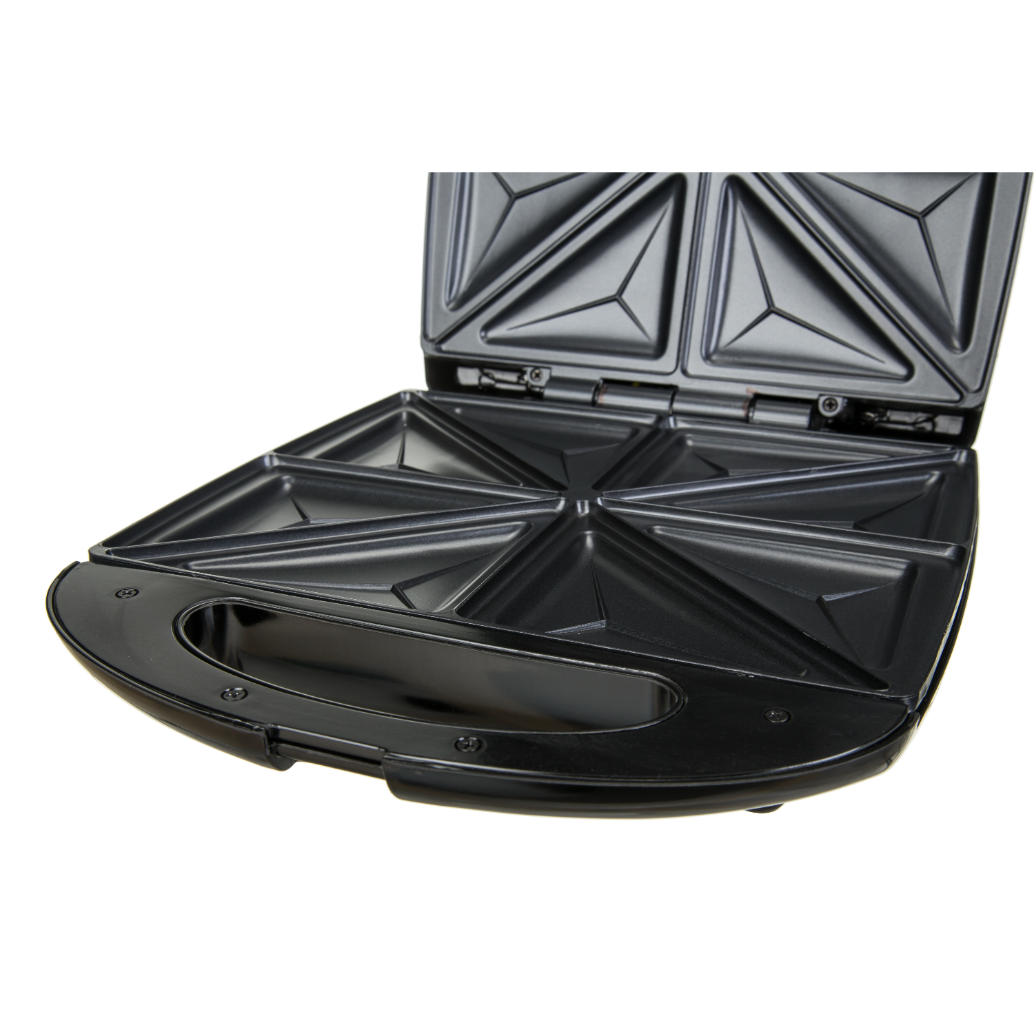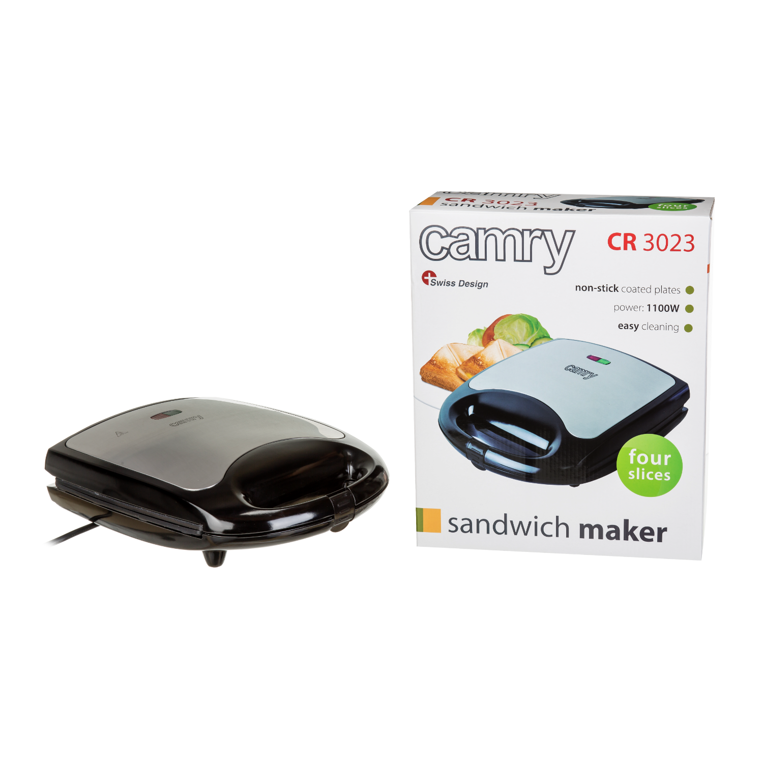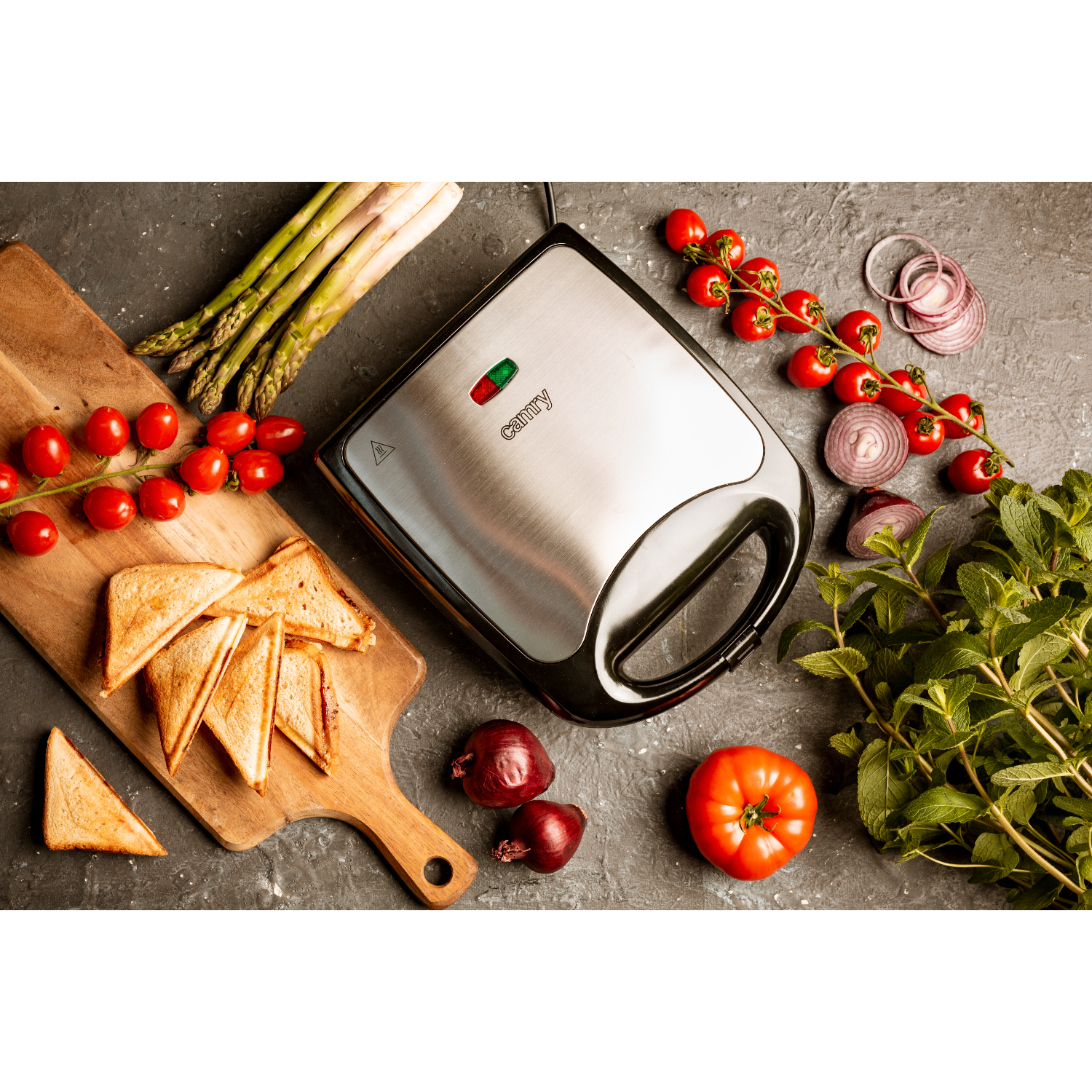 An useful sandwich toaster that has 1500W of power. It allows to prepare 4 sandwiches at the same time. The sandwiches will be divided into 8 pieces shaped as triangles. A special coat at the heating plates prevents the food from sticking to them. That is why keeping the device clean is very easy. A thermostat signalises when the plates are sufficiently heated up and controls the temperature and keeps it at a steady level during the whole toasting process This way the sandwiches are crispy and gold. The sandwich toaster can be stored in a vertical position – all for the user´s comfort.