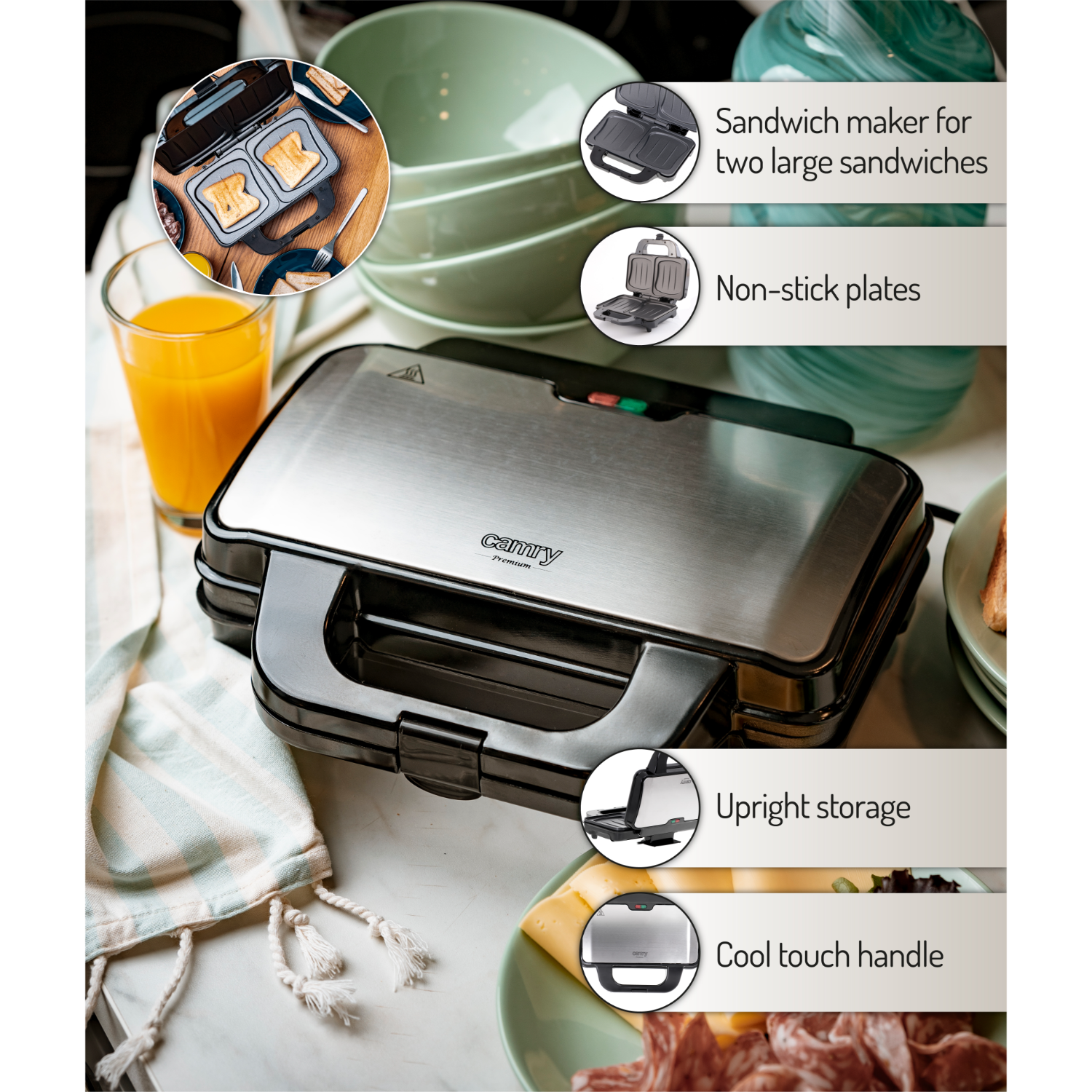 An useful sandwich toaster that has 1300W of power. It allows to prepare 2 sandwiches at the same time. A special coat at the heating plates prevents the food from sticking to them. That is why keeping the device clean is very easy. A thermostat signalises when the plates are sufficiently heated up and controls the temperature and keeps it at a steady level during the whole toasting process This way the sandwiches are crispy and gold. The sandwich toaster can be stored in a vertical position – all for the user´s comfort